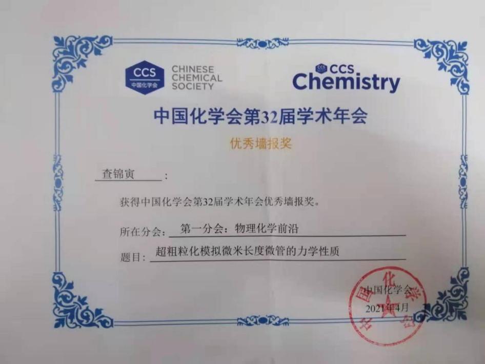 20日下午,查锦寅同学在“第一分会:物理化学前沿”版块进行了墙报展示,墙报论文题目为《超粗粒化模拟微米长度微管的力学性质》。该课题基于最新发展的无监督学习算法CK-CG,针对生物大分子难以建模模拟的问题,构建了微米尺度的微管模型,并研究了微管的抗弯能力。在展示期间,前来和查锦寅同学向前来交流的老师和同学进行了细致讲。解络绎不绝,查同学与他们热情交流,耐心讲解。在此过程中,查同学通过墙报展示,不仅锻炼了他的学术交流的能力,也从交流中收获了很多启发,。他图文并茂的墙报内容和兢兢业业的交流讲解让他荣获本次年会的“优秀墙报奖”,成为为数不多获此殊荣的本科生同学。