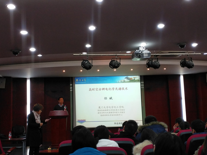 任斌教授这次报告主要介绍了表面增强拉曼光谱(SERS)和针尖增强拉曼光谱(TERS)技术与电化学技术相结合,通过电化学原位光谱技术,实现了在分子尺度研究电化学表/界面电化学过程,获得了常规稳态SERS光谱技术无法获得的动力学信息。并介绍了为了能够从纳米尺度表征电化学界面,其课题组巧妙的设计电化学原位TERS电解池,优化TERS光路系统,解决了收集拉曼信号较弱的难点,成功搭建了高时空分辨电化学拉曼光谱技术平台。利用该平台,他们首次在国际上揭示了巯基苯甲氰分子在单层Pd/Au(111)单晶异质界面自组装过程,获得了巯基苯甲氰分子在Pd单分子层表明,Au(111)表面以及Pd/Au台阶处精细电化学拉曼光谱。