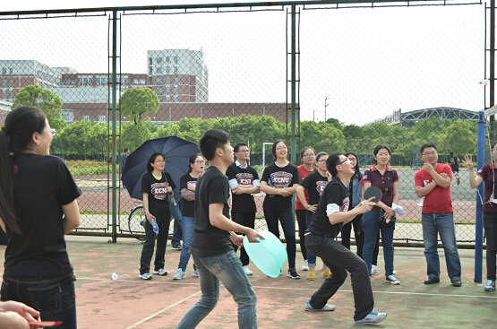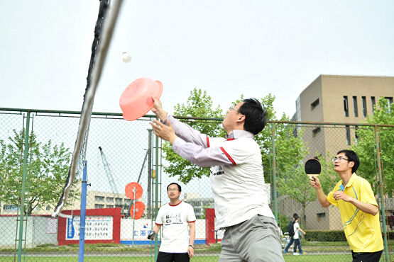 洋葱圈的热潮还没过,马上就进行了下一场比赛——趣味羽毛球和挤眉弄眼。每个队员分别用自己挑选的道具击打羽毛球。由于道具的限制,技术高超的老师们也犯了难,但是通过团队中大家的团结合作,老师和同学们很快就掌握了小窍门,与对手激烈的比赛起来。