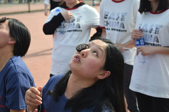 而同场进行“挤眉弄眼”项目比拼的老师和同学们则需要在不能用手的情的情况下,通过脸部肌肉的力量,把脸上的饼干吃到嘴里。平时在课堂上,实验室里严肃认真的老师们也显露出来可爱的一面。