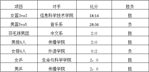 男篮5对5比赛化学与分子工程学院和生命与科学学院联合组队参加对战音乐系。开场后“生化联队”一度领先11分,但由于人员轮换的失误,最终 “生化联队”以28:36遗憾落败。