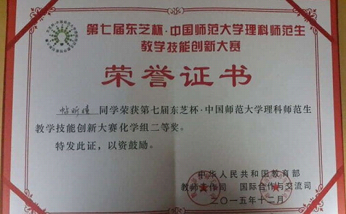 2015年12月25至27日,第七届“东芝杯·中国师范大学理科师范生教学技能创新大赛”在华南师范大学石牌校区举行。来自全国43所师范大学125名决赛选手经过两天的激烈角逐,最终化学与分子工程学院的帖昕曈同学(指导教师:占小红、丁伟、王祖浩)获化学组二等奖,在42名各师范大学化学科代表选手中名列第二,创我校在历届东芝杯比赛中取得的最好成绩。